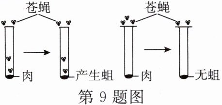 9. 如图所示是某科学兴趣小组做的腐肉“自然”生蛆的实验过程,从该实验中,我们可以得到的启示是肉腐败是主要受