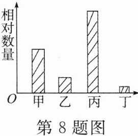 8. 如果一个处于稳定状态的生态系统中的四种生物构成了食物链的关系,在某一时间内它们的相对数量关系如图所示。若乙的数量增加,在一段时间内将引起(