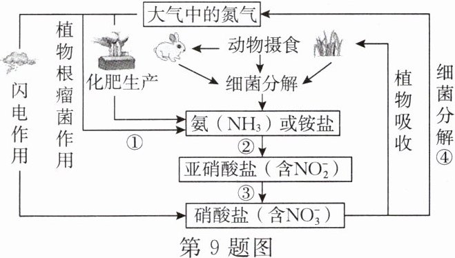 9. 氮是自然界各种生物体完成生命活动时不可缺少的重要元素,自然界中氮的循环如图所示。