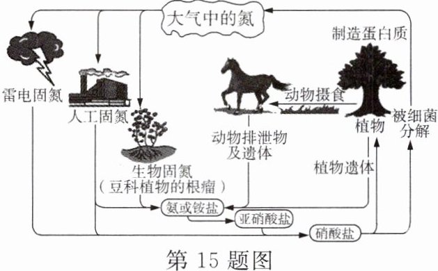 15. 氮是空气中含量最多的元素,也是构成生物体的必要元素之一。但是,空气中游离态的氮不能直接被大多数生物所利用,必须经过变化,并与其他元素形成化合物(如氨或铵盐等),才能被植物利用。如图所示是自然界氮循环的示意图。请回答下列问题: