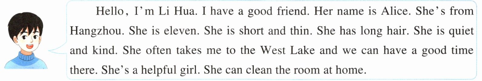 Hello, I'm Li Hua. I have a good friend. Her name is Alice. She's from Hangzhou. She is eleven. She is short and thin. She has long hair. She is quiet and kind. She often takes me to the West Lake and we can have a good time there. She's a helpful girl. She can clean the room at home.
