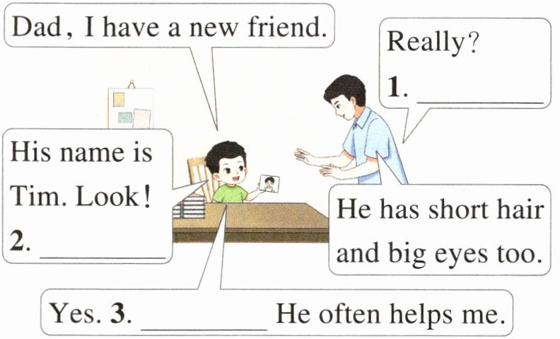 1. long hair 2. short hair 3. tall and strong 4. short and thin 5. kind 6. quiet (第4和第6小题答案可互换)