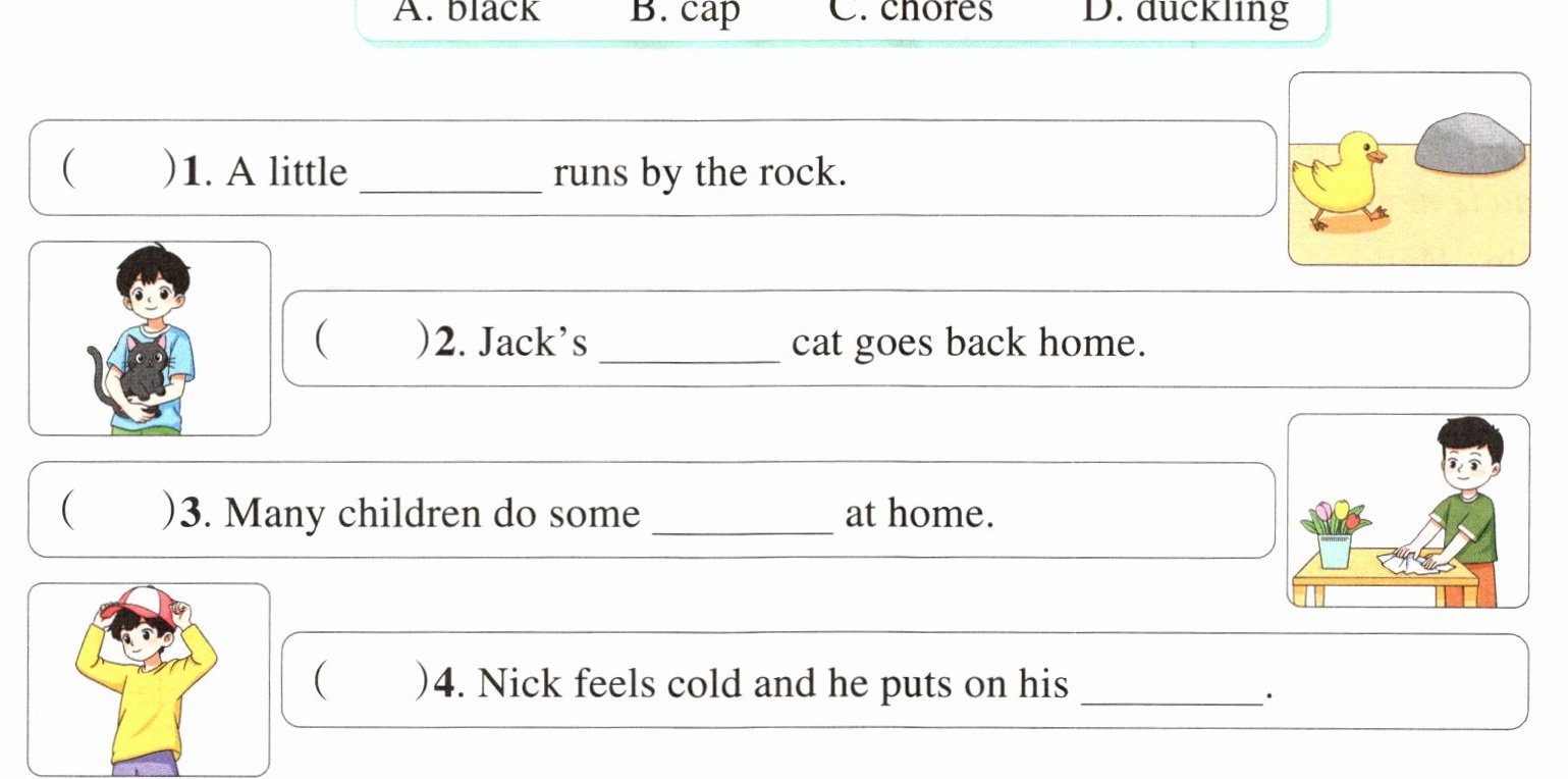 ( )2. A. cap B. rice C. black