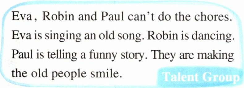 Eva, Robin and Paul can't do the chores. Eva is singing an old song. Robin is dancing. Paul is telling a funny story. They are making the old people smile. Talent Group