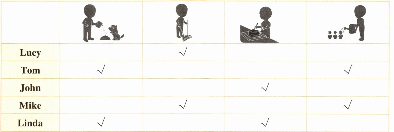 二 Mary 调查了小组内同学做家务的情况。根据调查表内容,判断下列句子正(T)误(F)。