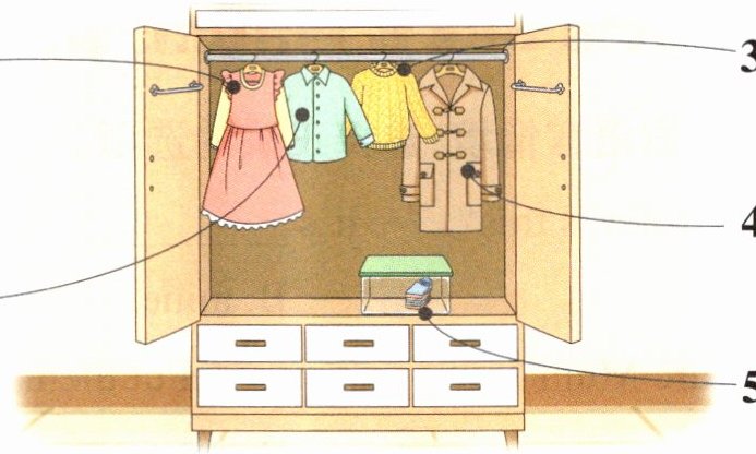 一 下面是 Lily 的衣柜。根据图片提示,把对应的单词写在四线三格上。
