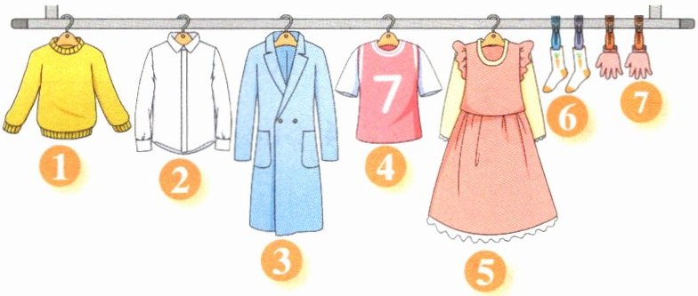 【服饰类】1. sweater 2. shirt 3. coat 4. T-shirt 5. dress 6. socks 7. gloves 【季节类】1. spring 2. summer 3. autumn 4. winter
