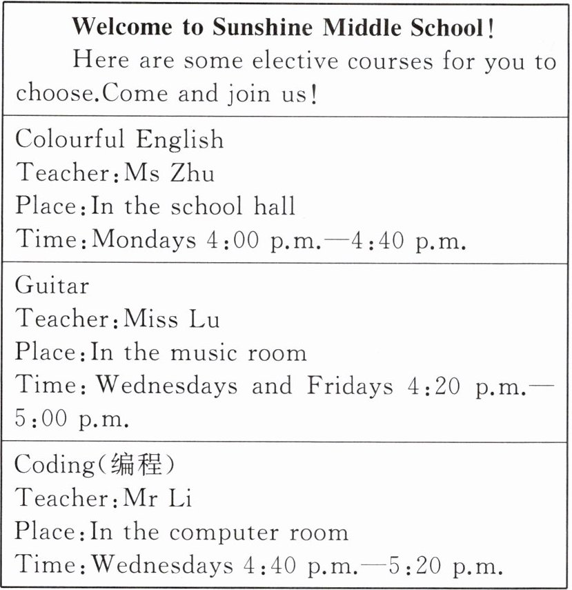 | Welcome to Sunshine Middle School!Here are some elective courses for you to choose.Come and join us! |