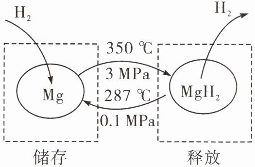 (工作原理图:Mg与$H_2$在350℃、3 MPa下储存生成$MgH_2$,$MgH_2$在287℃、0.1 MPa下释放生成Mg和$H_2$)
