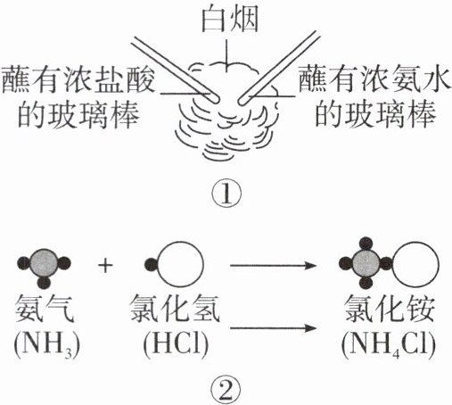 (图①:两根玻璃棒分别蘸有浓盐酸和浓氨水,靠近产生白烟;图②:氨气分子+氯化氢分子→氯化铵分子微观示意图)