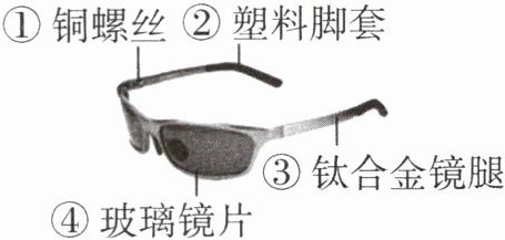 (变色眼镜示意图:标注①铜螺丝、②塑料脚套、③钛合金镜腿、④玻璃镜片)