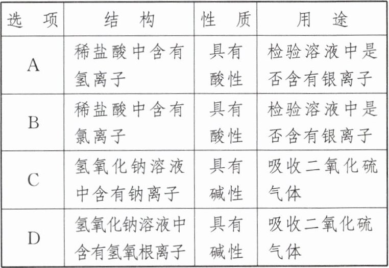 | A | 稀盐酸中含有氢离子 | 具有酸性 | 检验溶液中是否含有银离子 |