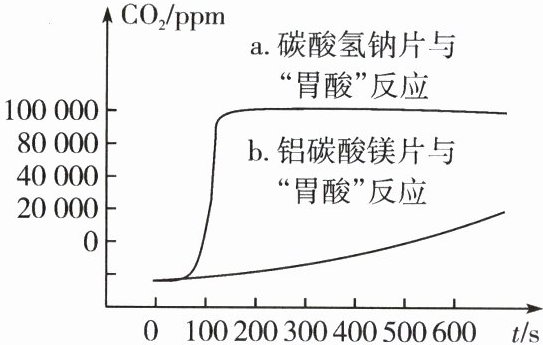 (3)碳酸氢钠片;由图像可知,相同时间内碳酸氢钠片反应产生CO₂的浓度远大于铝碳酸镁片,会导致胃内气体过多。