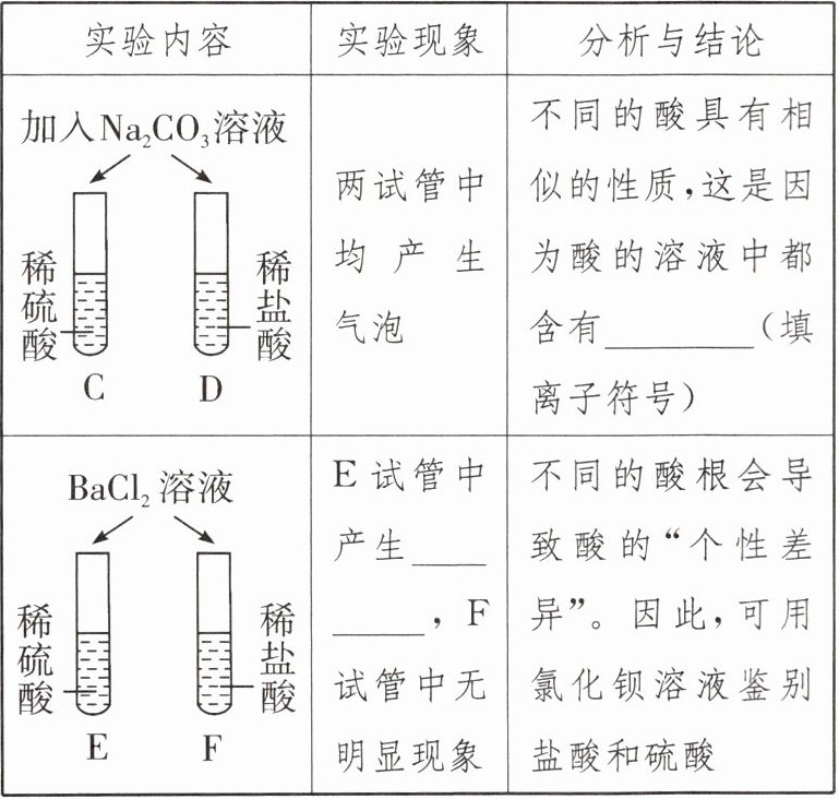 |$BaCl_2$溶液稀硫酸 E 稀盐酸 F|E试管中产生______,F试管中无明显现象|不同的酸根会导致酸的“个性差异”。因此,可用氯化钡溶液鉴别盐酸和硫酸|