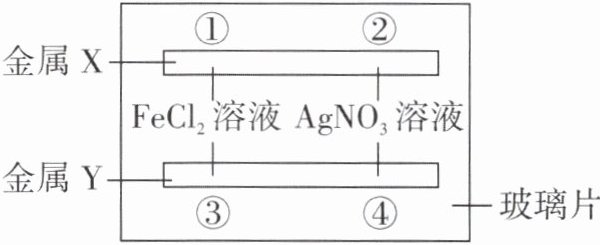 7. 为了测定金属活动性强弱,某同学设计了如图所示的实验,向打磨过的金属X和金属Y上滴加不同溶液,金属X上仅②处有明显现象,金属Y上③和④处均有明显现象。关于该实验,下列说法错误的是 ( )