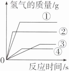 8. 相同质量的铁、锌、镁、铝分别与足量的盐酸反应,产生氢气的质量与反应时间的关系如图所示,图中曲线①②③④对应的金属是 ( )