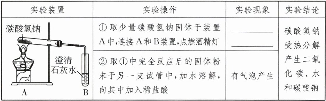 | | ①取少量碳酸氢钠固体于装置A中,连接A和B装置,点燃酒精灯 | ______ | 碳酸氢钠受热分解产生二氧化碳、水和碳酸钠 |