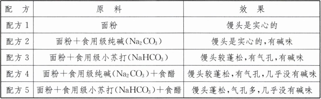 | 配方5 | 面粉+食用级小苏打$(NaHCO_3)+$食醋 | 馒头蓬松,气孔多,几乎没有碱味 |