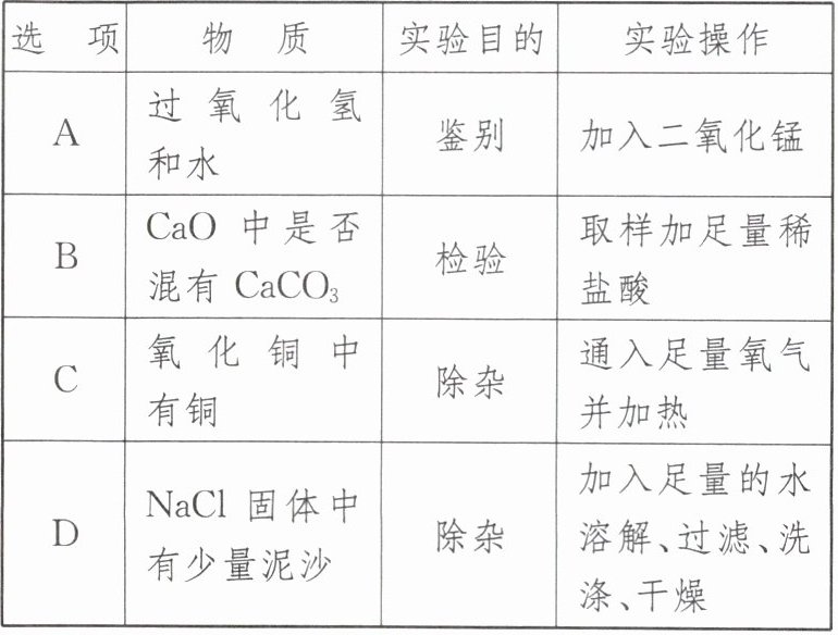 |B|CaO中是否混有$CaCO_3$|检验|取样加足量稀盐酸|