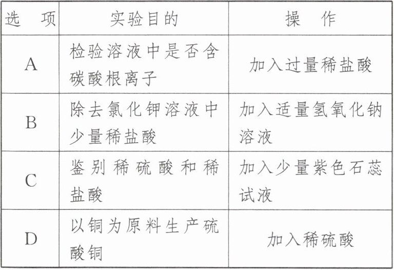 |B|除去氯化钾溶液中少量稀盐酸|加入适量氢氧化钠溶液|