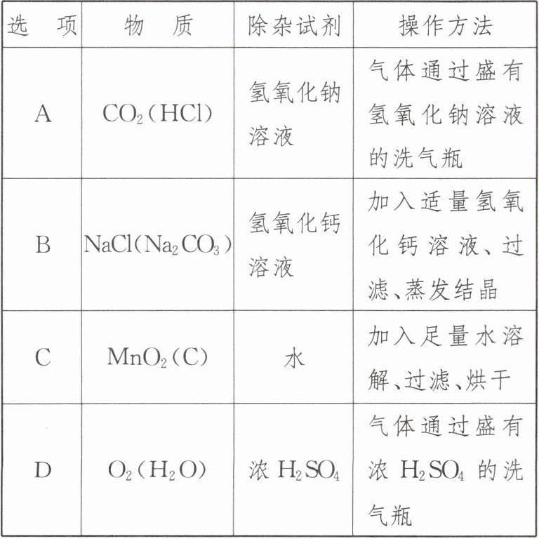 |C|NaOH溶液$[Ca(OH)_2$溶液]|通入过量$CO_2$气体,充分反应后过滤|