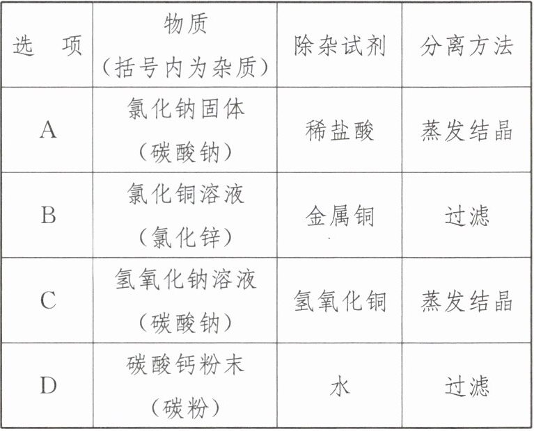 |B|$NaCl(Na_2CO_3)$|氢氧化钙溶液|加入适量氢氧化钙溶液、过滤、蒸发结晶|