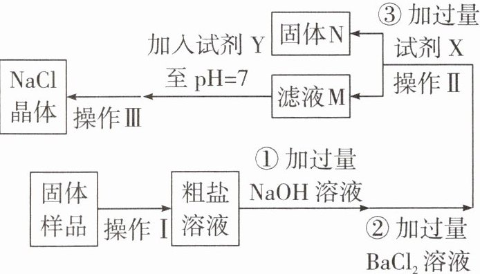 11. 在除杂质的操作中,为了将杂质完全去除,通常需加入过量的除杂试剂。为了除去NaCl样品中混有的少量$Na_2SO_4$和$MgCl_2,$某校科学课外活动小组设计的提纯NaCl的流程如图所示: