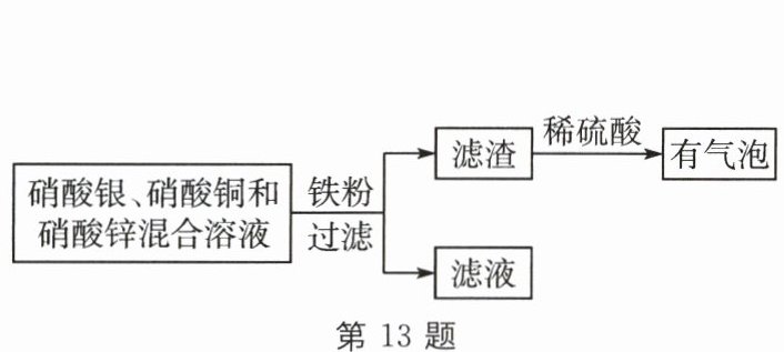 13. 小科对硝酸银、硝酸铜和硝酸锌的混合溶液进行了图示操作,下列分析正确的是( )