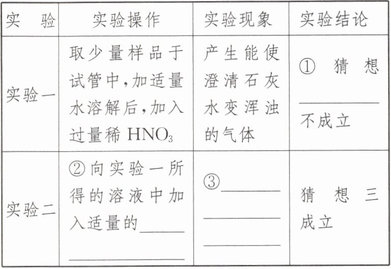 | 实验一 | 取少量样品于试管中,加适量水溶解后,加入过量稀 $HNO_3$ | 产生能使澄清石灰水变浑浊的气体 | ① 猜想______不成立 |