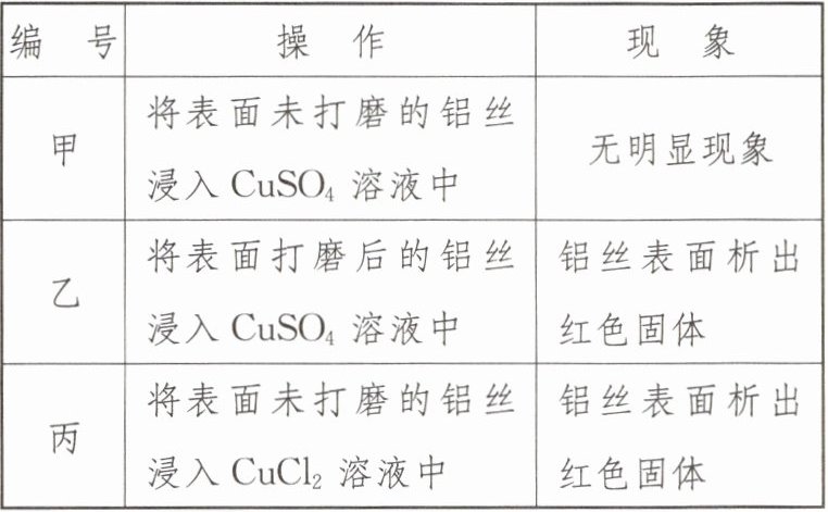 | 甲 | 将表面未打磨的铝丝浸入 $CuSO_4$ 溶液中 | 无明显现象 |