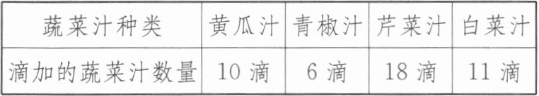 | 滴加的蔬菜汁数量 | 10滴 | 6滴 | 18滴 | 11滴 |