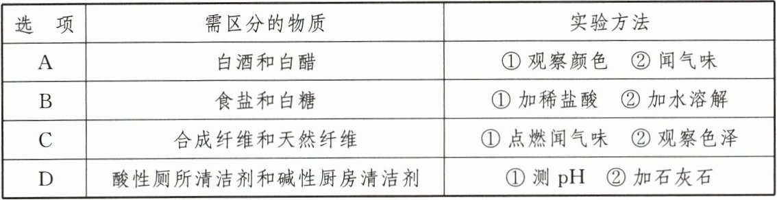 |B|食盐和白糖|①加稀盐酸 ②加水溶解|