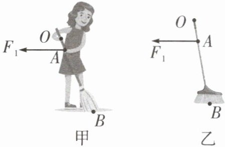 9. 如图甲所示,小华用笤帚在扫地,O为支点,作用在A点的动力为$F_{1}$。在图乙中画出作用在B点的阻力$F_{2}的示意图及其力臂l_{2}$。