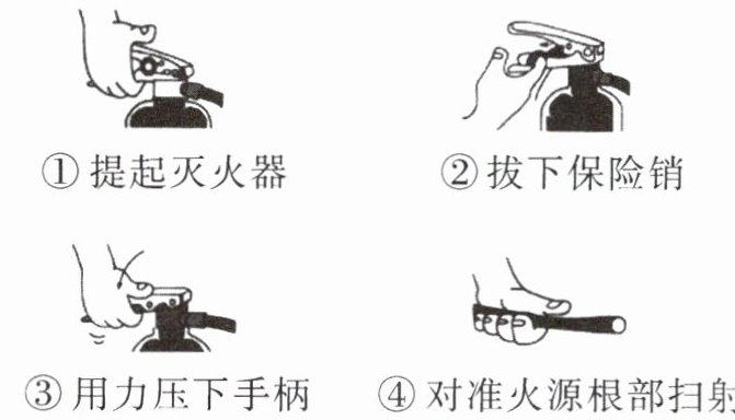 ① 提起灭火器 ② 拔下保险销 ③ 用力压下手柄 ④ 对准火源根部扫射