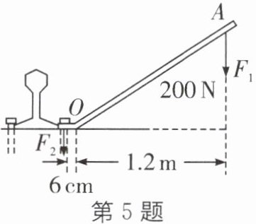 5. 如图所示为铁道检修工用的道钉撬,有关尺寸见图。若在A点竖直向下作用200 N的力,道钉撬对道钉会产生的力为______N,此情况下该道钉撬属于______杠杆。如果要求在保持手的作用力大小和作用点不变的情况下,使道钉撬对道钉的作用力最大,可以采用的方法是______。