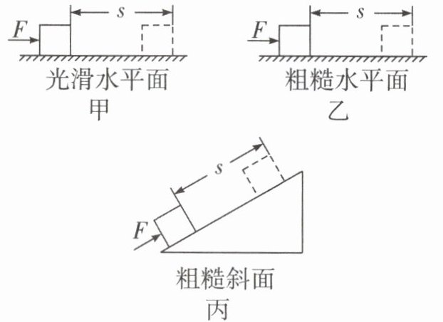7. 如图所示,物体在相同力F的作用下,分别在光滑水平面、粗糙水平面和粗糙斜面上沿着力的方向移动了相同的距离s,力F做的功分别为$ W_1、W_2、W_3 $,比较甲、乙、丙三次所做的功的大小 ( )