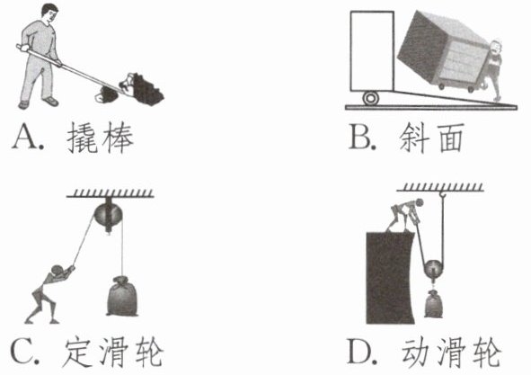 解析:撬棒是省力杠杆,能省力;斜面是省力机械,能省力;定滑轮实质是等臂杠杆,不省力但能改变力的方向;动滑轮实质是动力臂为阻力臂二倍的杠杆,能省力。因此一定不能省力的是定滑轮。