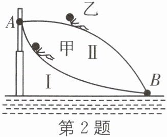 2. 如图所示,游乐场中,从高处A到水平面B处有两条长度相同的轨道Ⅰ和Ⅱ,其中轨道Ⅰ光滑,轨道Ⅱ粗糙。质量相等的小孩甲和乙分别用相同时间沿轨道Ⅰ和Ⅱ从A处滑向B处,两人重力做功的功率分别为P1和P2,则( )