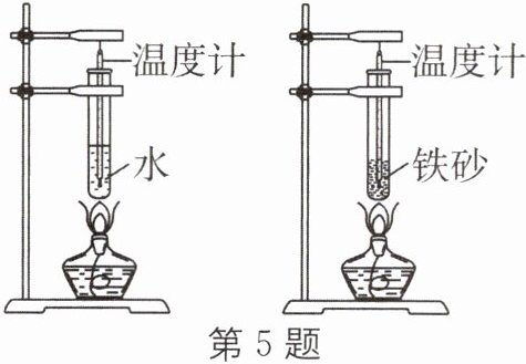 5. 用如图所示的两个相同装置,同时给质量相同的水和铁砂加热,升温较慢的物质是______,因为它的______较大。