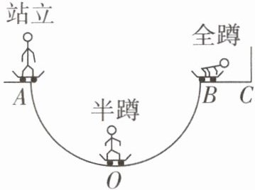 12. 滑板是深受青少年喜欢的一项体育运动。如图是U形滑台和运动员姿势的简化示意图。运动员在滑台A处下滑,仅依靠滑行,滑到与A相同高度的滑台B处时静止。请回答下列问题: