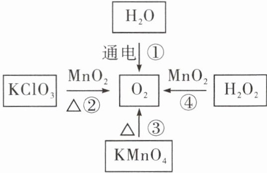 (注:图为流程图,结构为:$H_2O$通过“通电|①”指向$O_2;$$KClO_3$通过$“MnO_2/△$|②”指向$O_2;$$KMnO_4$通过“△|③”指向$O_2;$$O_2$通过$“MnO_2$|④”指向$H_2O_2)$