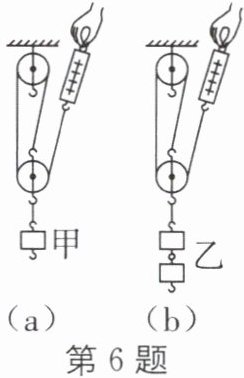 6. 在生产生活中,使用简单机械做功的情形比比皆是。如图所示,利用组装好的(a)、(b)滑轮组,分别将甲、乙两组钩码提起,(a)、(b)两个装置中钩码型号、定滑轮、动滑轮的型号都是完全一样的。不计绳子与滑轮之间的摩擦,则下列说法错误的是( )
