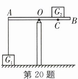 20. 如图所示,一轻质杠杆水平支在支架上,$OA= 20\ cm$,$G_1$重为60N,$G_2$重为20N。当$OC= 10\ cm$时,此时$G_1$对地面的压力为______N。现用一水平拉力使$G_2$以5cm/s的速度向右匀速直线运动,经过______s后,可使$G_1$对地面的压力恰好为零。