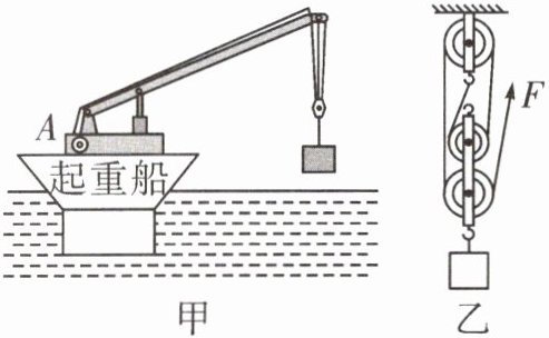 11. 如图甲为某起重船的示意图,A处为卷扬机,吊臂前端滑轮组如图乙所示。在一次吊装施工中,当起重船从运输船上吊起重物时,起重船浸入海水中的体积增加了$18\ m^3$,重物在空中匀速竖直上升了6 m,所用时间为40 s。已知动滑轮总重为$2×10^{4}\ N$,不计钢丝绳重及摩擦。求:($\rho_{海水}= 1.0×10^{3}\ kg/m^3$,g取$10\ N/kg$)