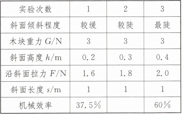 10. 为了探究斜面的机械效率与斜面倾斜程度之间的关系,探究小组的同学利用木板、刻度尺、弹簧测力计、木块等器材设计了如图所示的实验装置。实验测得的数据如表所示。