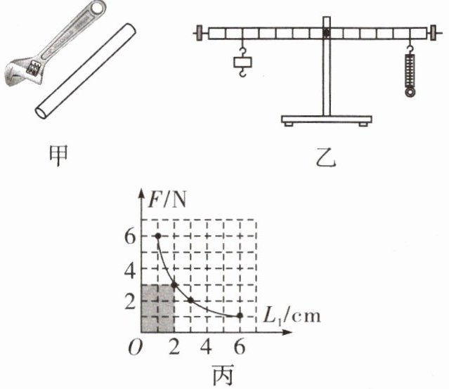 (2)改变动力臂,多次测量,根据记录的数据画出如图丙所示的动力随动力臂变化的图像,则杠杆左端所挂重物的重力是______N(杠杆上每一小格长度为1 cm),小科发现图像中每次描出的点与两坐标轴围成的方形面积(如图丙中阴影部分)总相等,原因是______。