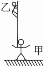 11. 杂技表演在我国具有悠久的历史。如图所示为杂技“顶竿”表演,甲站在地面上,肩上顶着一根重为$G_1= 50 N$的竖直竹竿,重为$G_2= 550 N$的乙沿竹竿匀速上爬4 m,然后甲顶着乙在水平地面上缓慢直立行走2 m。求在此过程中: