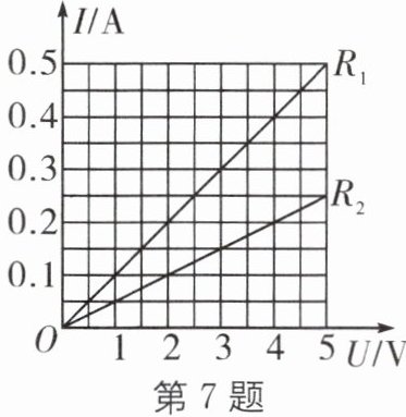 7. 两只定值电阻$R_1和R_2的I$-$U$图像如图所示。当把这两只电阻并联接在$4\ V$的电源上时,通过干路的电流是______;在相同时间内,产生热量更多的是______(填“$R_1$”或“$R_2$”)。