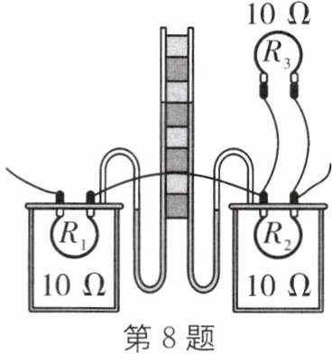 8. 小科利用如图所示装置探究电阻产生的热量与电流大小的关系,当电路正常工作且通电时间一定时,电阻______产生的热量多;若通过$R_1的电流为1\ A$,通电时间为$10\ s$时,阻值为$10\ \Omega的电阻R_2$产生的热量为______$J$。