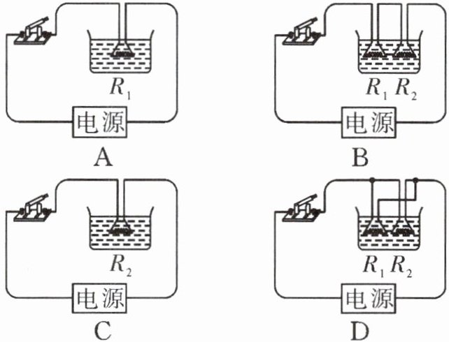 3. 如图所示,在四个相同水槽中盛有质量和温度都相同的纯水。现将阻值为$R_1$、$R_2$的电阻丝($R_1 < R_2$)分别按下图的四种方式连接放入水槽,并接入相同电源,水温升高最快的是 ( )